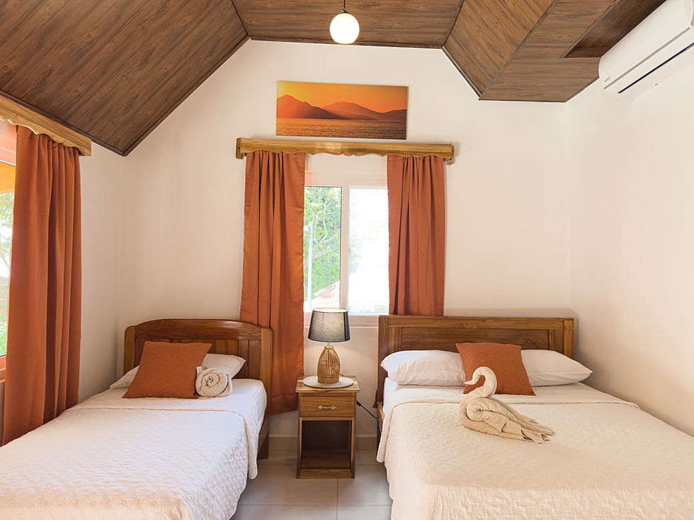 Cabaña única y amplia, literalmente frente al mar — ¡no hay nada más cerca del océano! Cuenta con dos camas dobles, aire acondicionado, baño privado, pequeño refrigerador, televisor y acceso a cocina compartida. Perfecta para familias o grupos que buscan despertar con la brisa y el sonido de las olas. Disfruta de la mejor vista de Santa Catalina y la auténtica experiencia frente al mar.